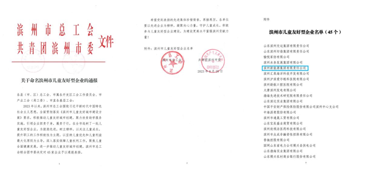 近日,市总工会、团市委在全市范围内选树并命名了45家儿童友好型企业,滨州新能源集团成功入选。此次选树活动旨在全市企业范围内推广儿童友好理念,认真履行关爱儿童的社会责任,积极构建关爱儿童工作的新格局。