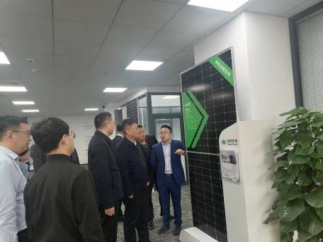 在海泰新能源科技有限公司上海运营中心,招商组一行参观了海泰光伏板、光伏支架等产品展区。唐山海泰新能科技股份有限公司董事、副总裁宣宏伟介绍了公司的发展历程、业务布局,海泰新能源科技(上海)有限公司总裁王海鹏介绍了当前与滨州市合作进展情况。双方均表示希望在现有合作的基础上持续深化在新能源领域更广泛深入的长期合作,携手推动能源绿色发展。