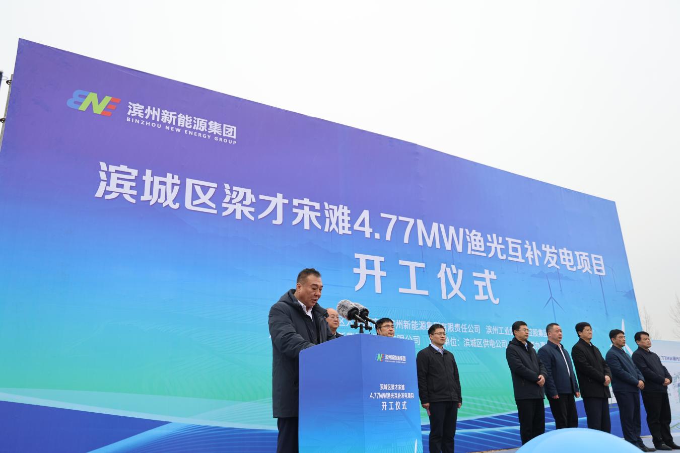 在全市上下各个领域、各条战线全面掀起决战决胜“三大战役”之际,滨州新能源集团抢时夺势,开年即开工、开工即开干,在2月18日节后上班第一天,联合滨城区人民政府成功举办梁才宋滩4.77MW渔光互补发电项目开工仪式。市政府副秘书长术国强出席,滨城区委副书记、区长李刚,滨州新能源集团党委书记、董事长董建忠出席并致辞,滨城区副区长袁见主持仪式。