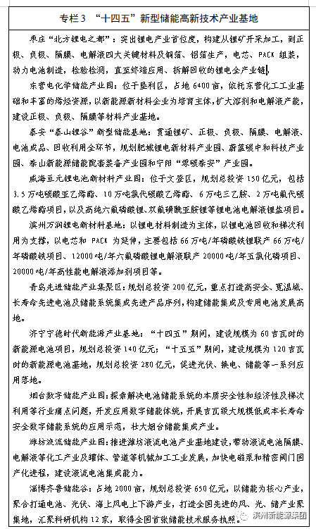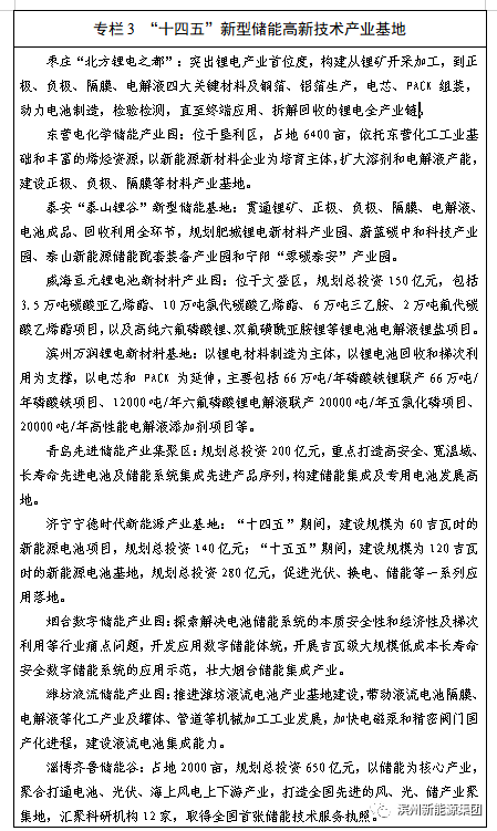 (六)培育一批特色鲜明的产业基地。聚焦储能产业链关键环节,立足区域优势,加快培育一批各具特色的产业聚集高地。在材料生产环节,重点打造枣庄“北方锂电之都”、东营电化学储能产业园、泰安“泰山锂谷”新型储能基地、威海亘元锂电池新材料产业园和滨州万润锂电新材料基地。在设备制造环节,重点打造青岛先进储能产业集聚区、济宁宁德时代新能源产业基地和潍坊液流储能产业园。在储能集成环节,重点打造山东电工电气储能产业基地和烟台数字储能产业园区。在相关服务环节,重点打造淄博齐鲁储能谷。