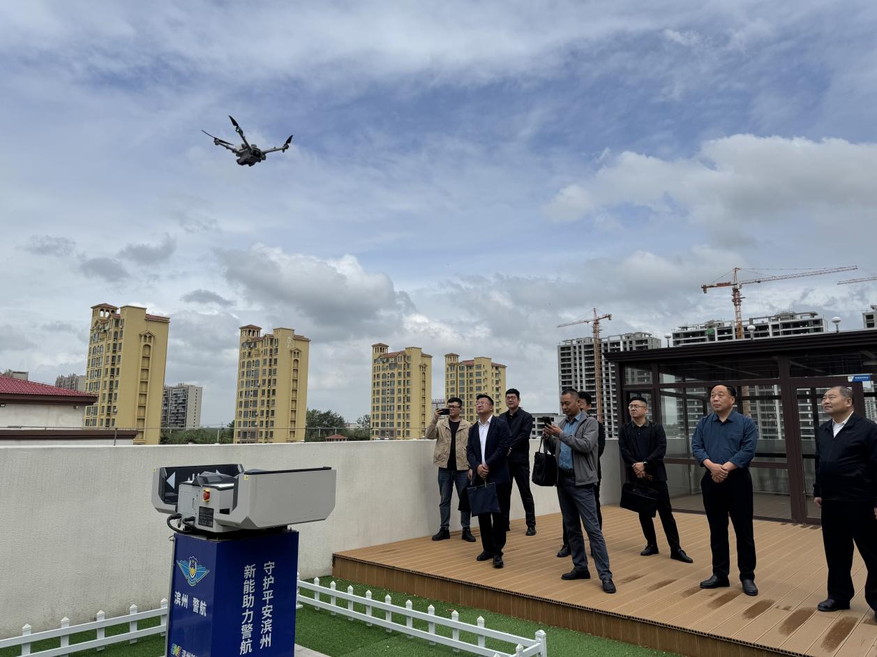 调研组一行实地参观了滨州市低空智能感知一体化平台调度中心,听取了平台建设情况的介绍,观看了各功能板块及无人机巡查演示,并观摩了“光储充用”自动化无人值守机场试点工程和配备的应急移动无人机侦察车。