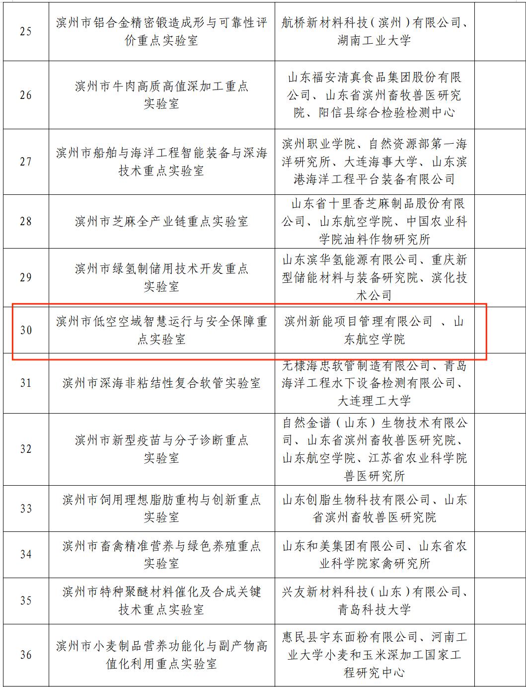 11月18日,滨州市科学技术局公示2025年滨州市重点实验室(第一批)拟筹建名单,由滨州新能项目管理有限公司与山东航空学院共建的滨州市低空空域智慧运行与安全保障重点实验室成功入选。