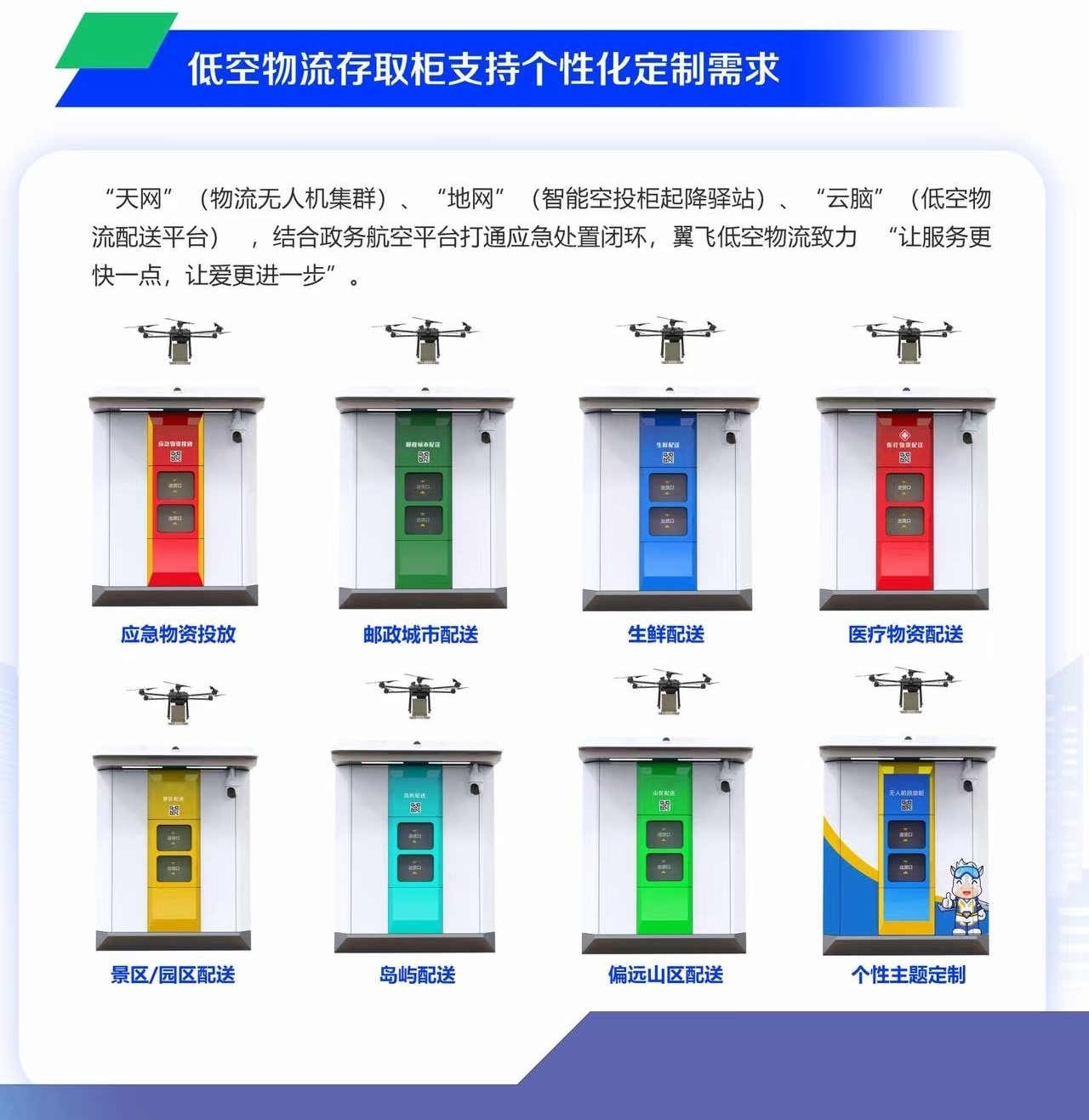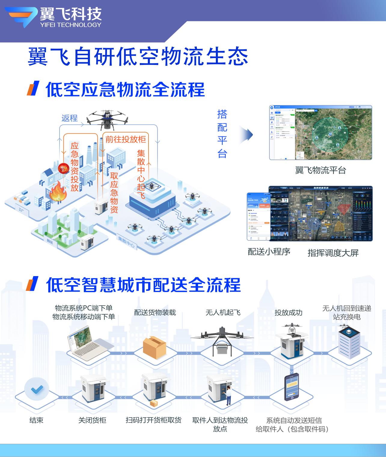 作为专注于低空智慧物流的技术驱动型企业,山东翼飞科技致力于低空飞行器研发、数字孪生场景构建与低空测试服务,为客户提供涵盖 "设备-系统-服务"的全周期无人机物流解决方案,真正实现"以科技赋能产品,以产品驱动智慧物流"。公司全面覆盖低空物流配送流程,从高效适配多场景的物流无人机,到智能管控的物流柜,再到一体化调度系统,全方位满足行业高效、智能、安全的核心需求。
